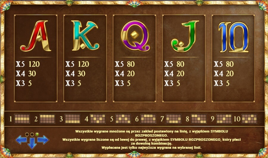 W grze pojawia się 10 różnych symboli, które wypłacają za kombinacje od 2 do 5 obrazków na linii i 3-5 w przypadku tańszych ikon. Mnożnik zakładu za kombinacje przedstawia się następująco.
